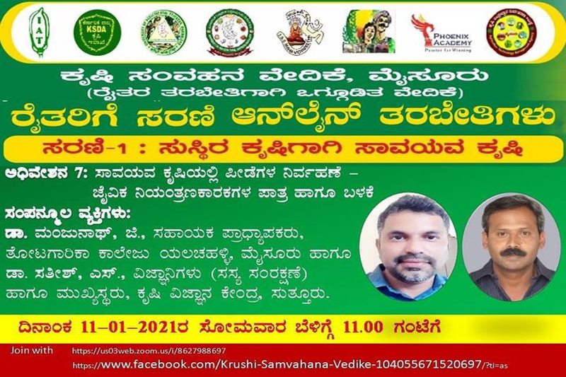 Sustainable organic agriculture; Series webinar training programme.With the joint venture of various district departments an online series webinar training programme has conducted every Monday from last week of November 2020. Sri. S. Satheesh, Senior Scientist and Head (in-charge) has a session on pest and disease management in organic farming on 11.01.2021. More than 215 farmers were participated through online. |