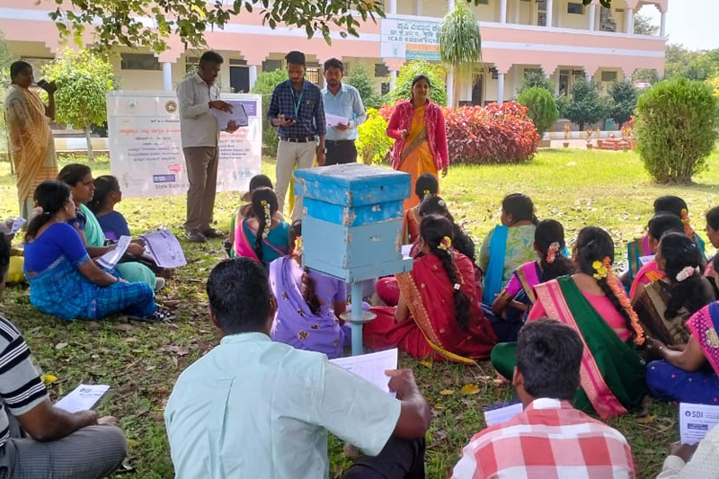Skill training programme for SHG membersSkill oriented programme has been organized for the SriSrikeshtra Darmastala Rural Development Project SHG members on 27.11.2022. During the programme grafting, honey production skill has been taught through demonstration. Later trainees visited to demo units of the KVK. More than 50 farmers and farmwomen were participated in the programme. |