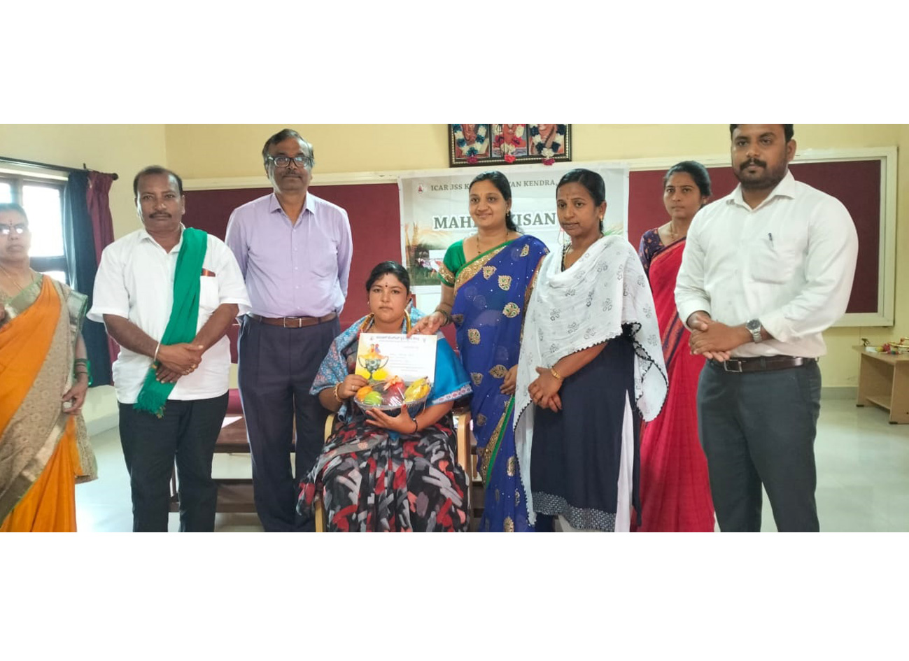 Celebration of Mahila Kisan Divas at ICAR JSS KVK Suttur, MysuruICAR JSS Krishi Vigyan Kendra celebrated Mahila Kisan Diwas on 15-10-2022. During the program, Smt. Mahalakshmi Prabhakar, B C Halli, Bannur Hobli, T Narasipura Taluk, a progressive dairy farmer who supplies around 180 litres of milk to Milk Cooperative society was felicitated. During the program a session on financial literacy was organized for creating awareness on different schemes and insurance for women farmers. Around 40 women farmers and 30 male farmers participated in the program. |