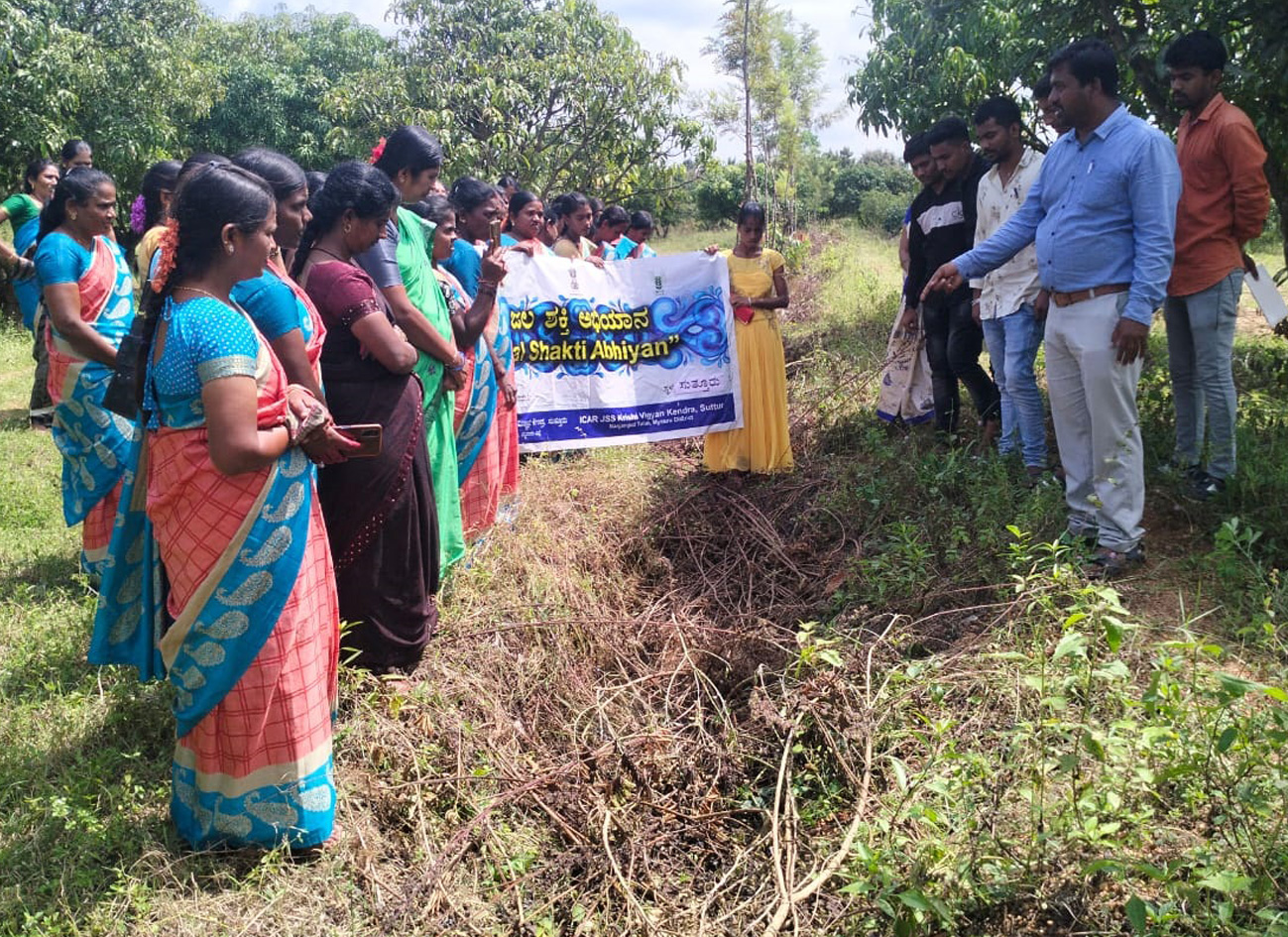 Jalshakthia Abhiyana awareness program to SHG groupsOn 20th October 2022, Jalashakthi Abhiyana awareness program to SHG groups of SKDRDP Nanjangud was organized at ICAR JSS KVK campus. SKDRDP participants visited soil and water conservation structure like trench cum bunds and percolation ponds in instructional farm of KVK. The visit was facilitated and coordinated by KVK agronomy scientist Shri. Shamaraj and also explained watershed concept, soil and water conservation methods like opening of trench cum bunds, percolation ponds and contour cultivation. |