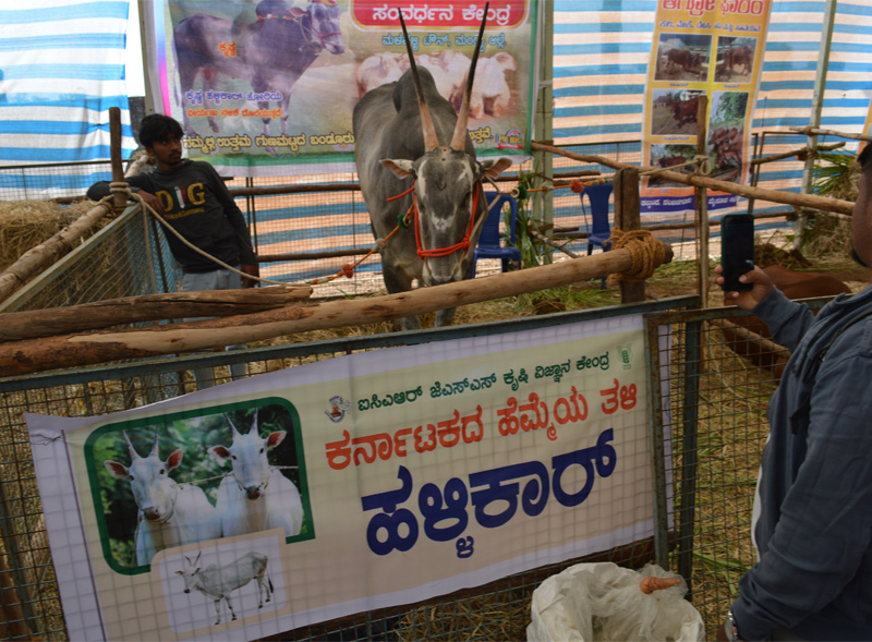 Krishimela- LivestockDemonstration of DESI breeds of cows (Punganur, Kankrej), bundur sheep, goats, chickens and Mudhol dogs, various types of fish breeds and ornamental fishes were exhibited in the animal husbandry section of Krishimela. |